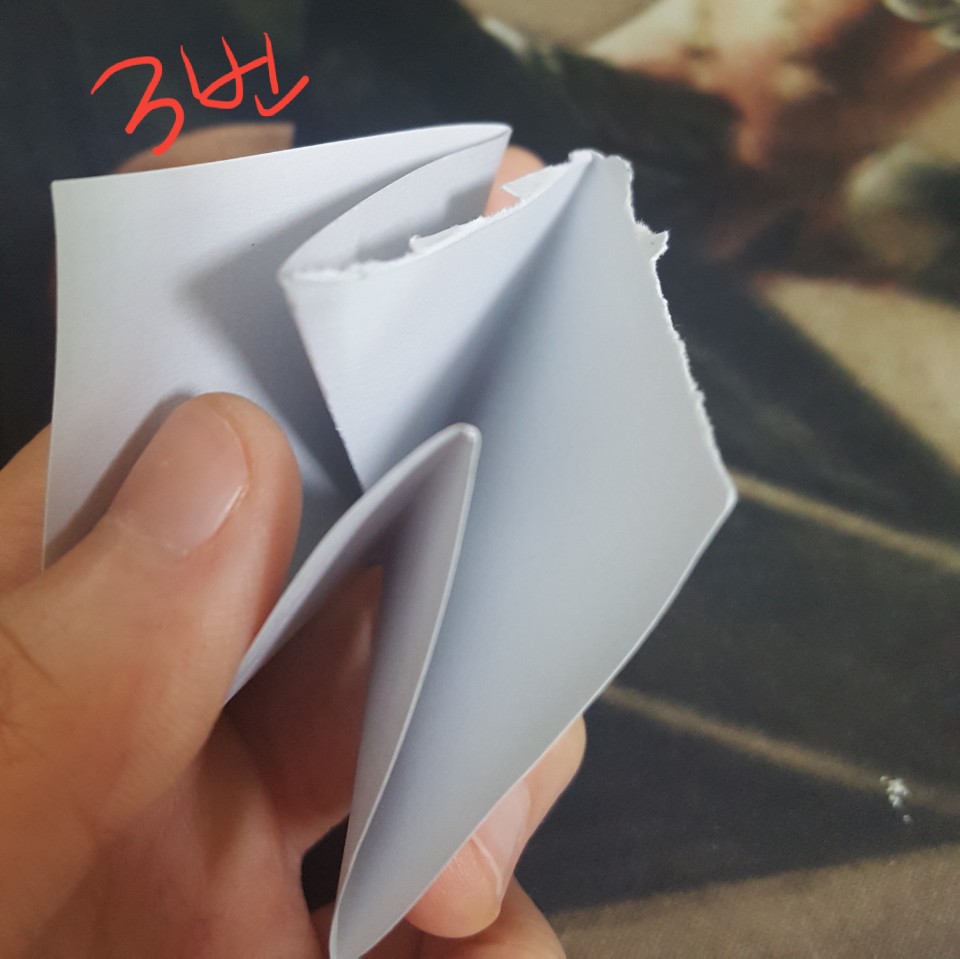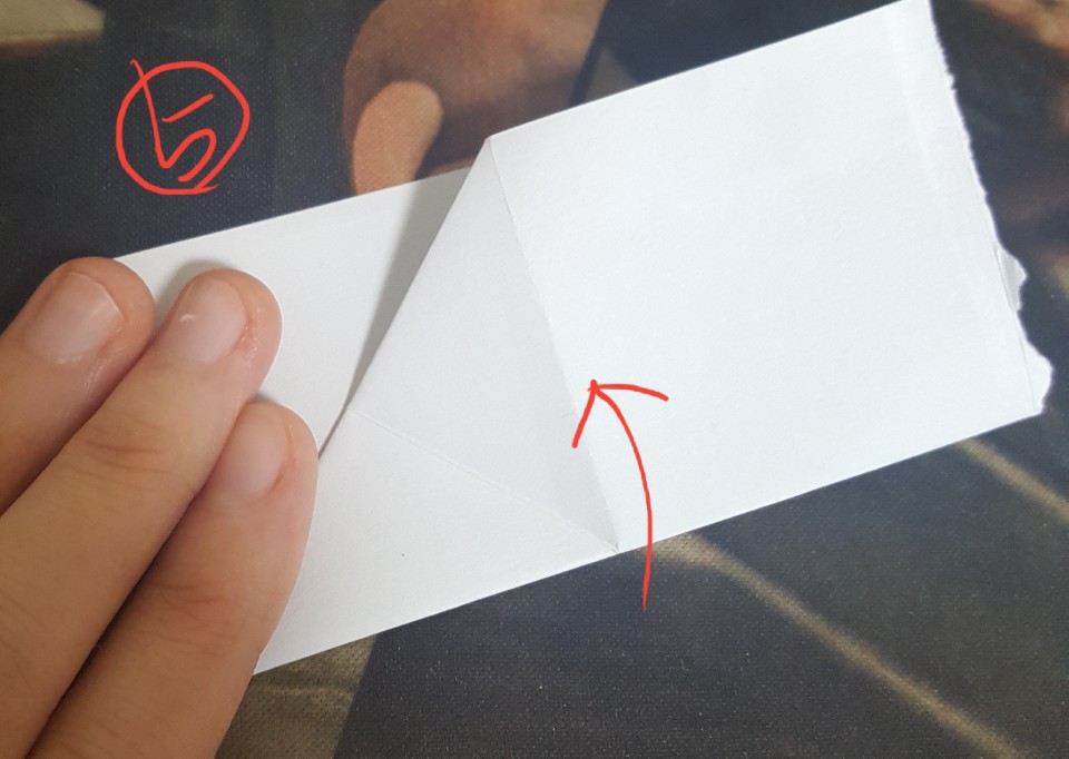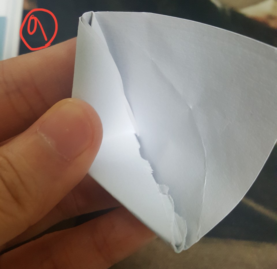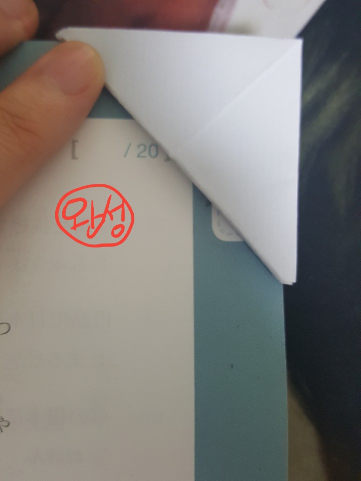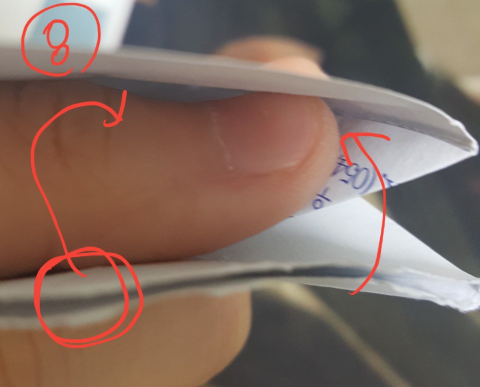 책갈피로 써본 모양입니다 원래는 가운데에 접기 모양이 안 나는데 제가 실수로 반대로 접어서 저런 모양이 생겼어요